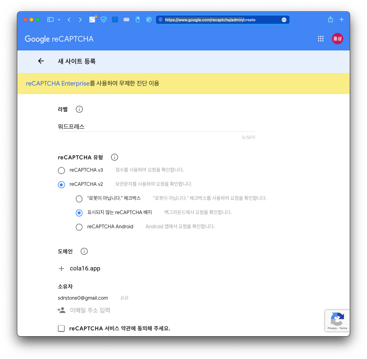 reCAPTCHA 유형은 v2의 표시되지 않는 reCAPTCHA를 적용하였습니다.