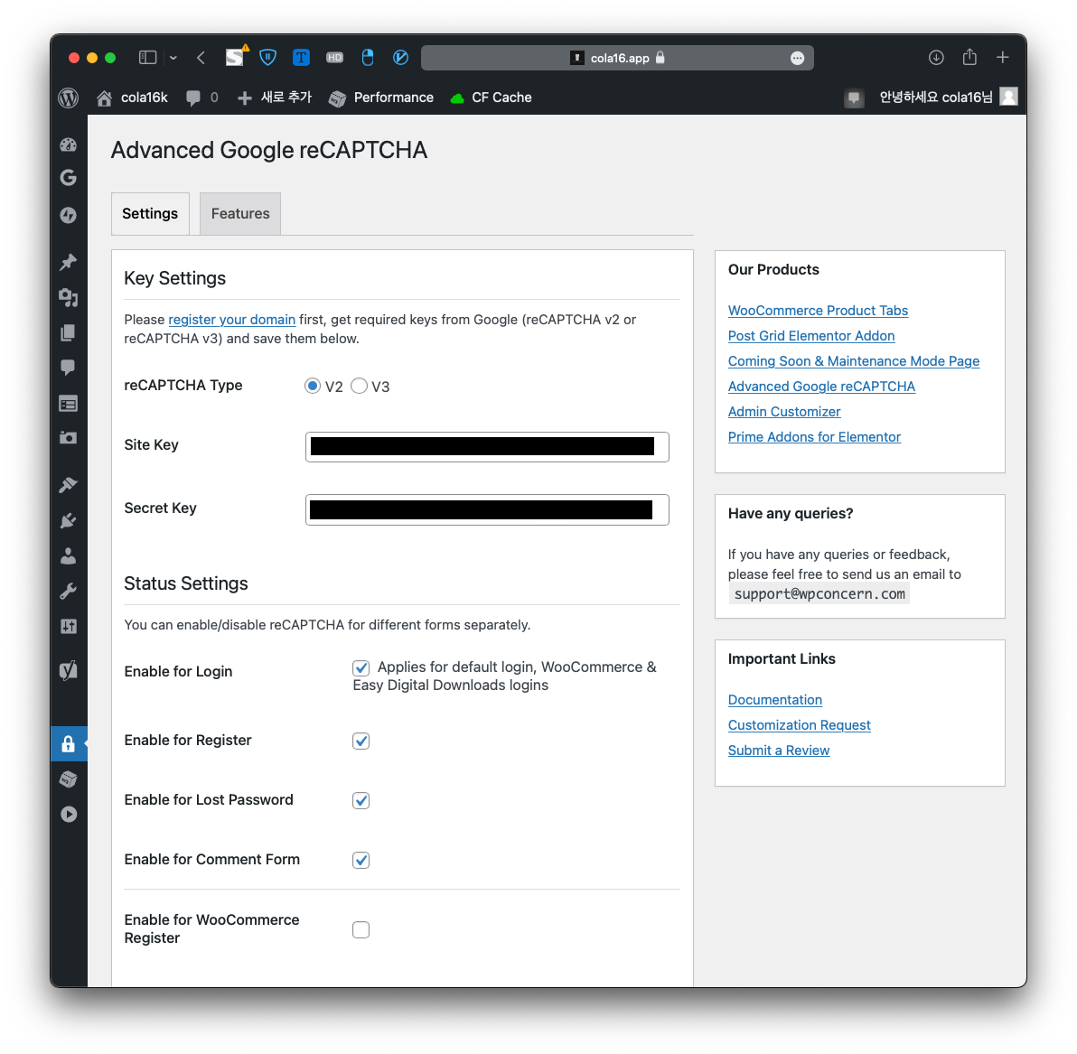 사이트키와 비밀키를 넣어주고 적용하면 끝납니다.