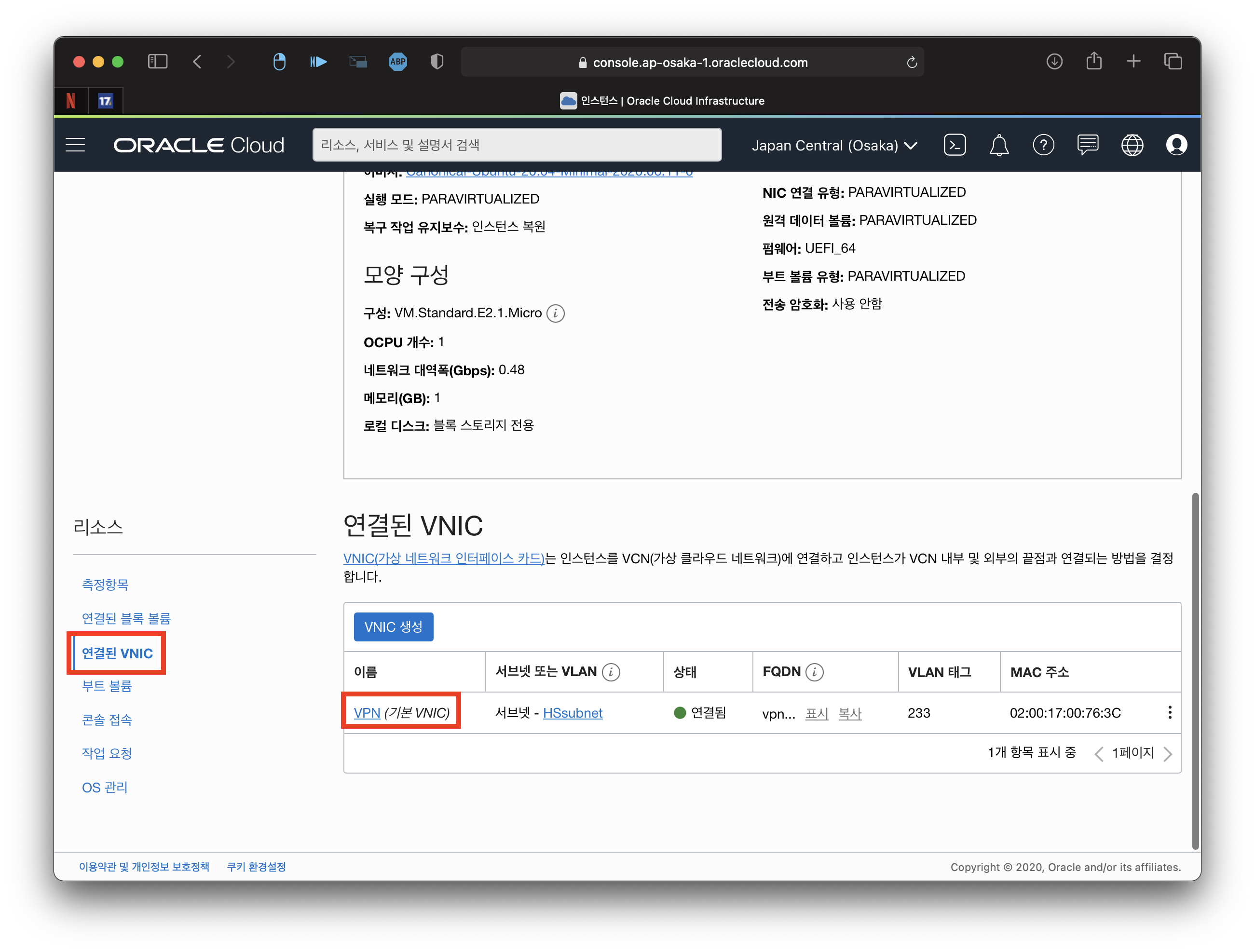 하단에서 리소스에 보면 연결된 VNIC 항목이 있습니다.