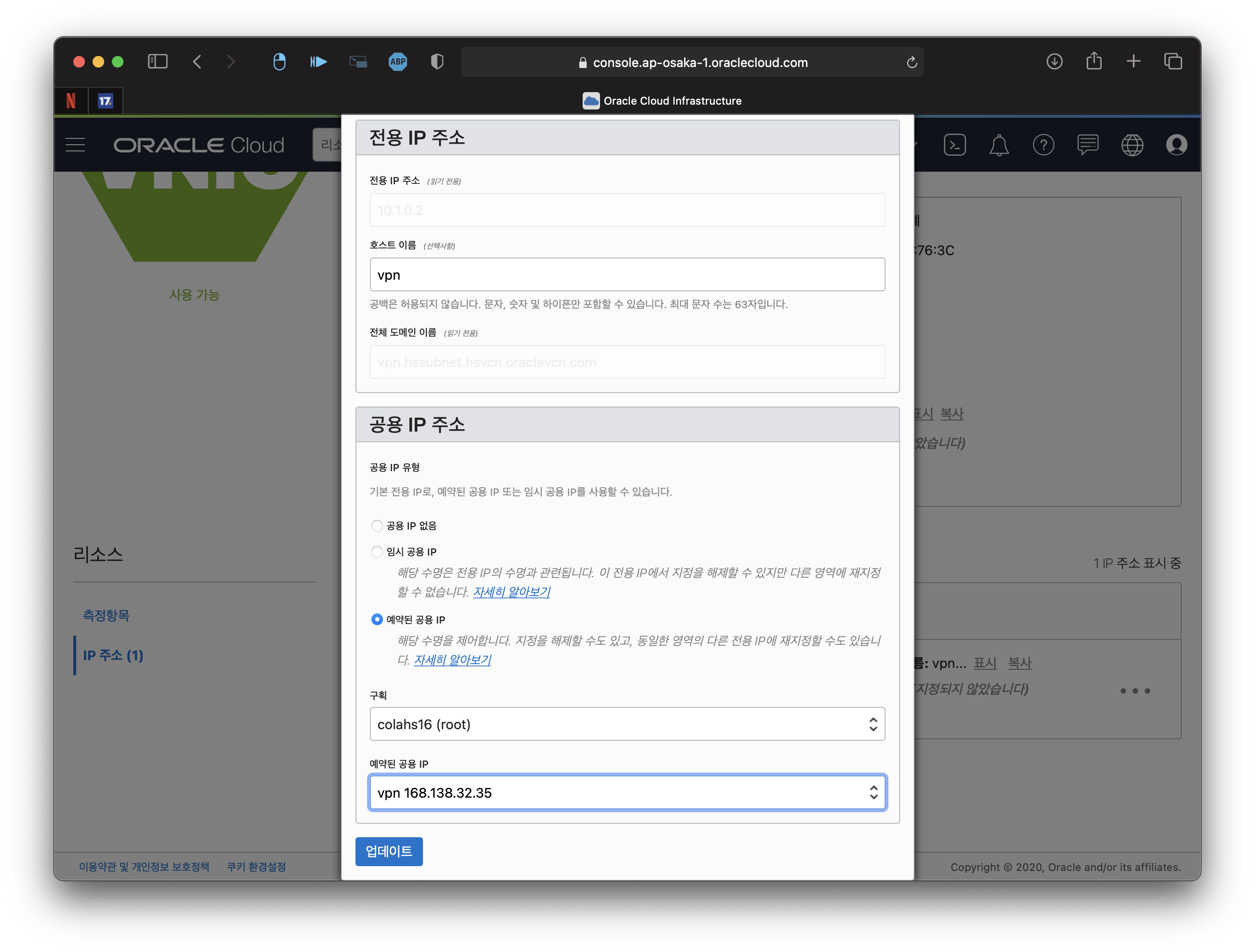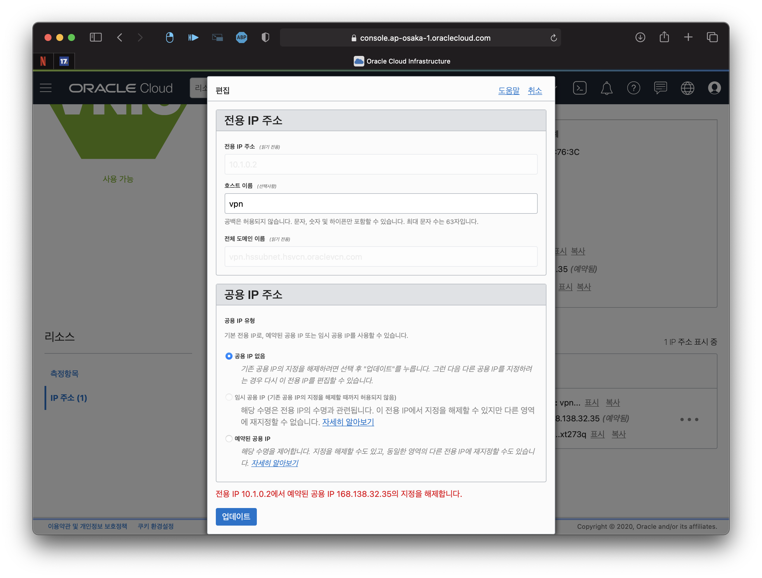 그래서 먼저 공용 IP를 없앤 후 예약된 공용 IP를 설정해줘야 합니다.