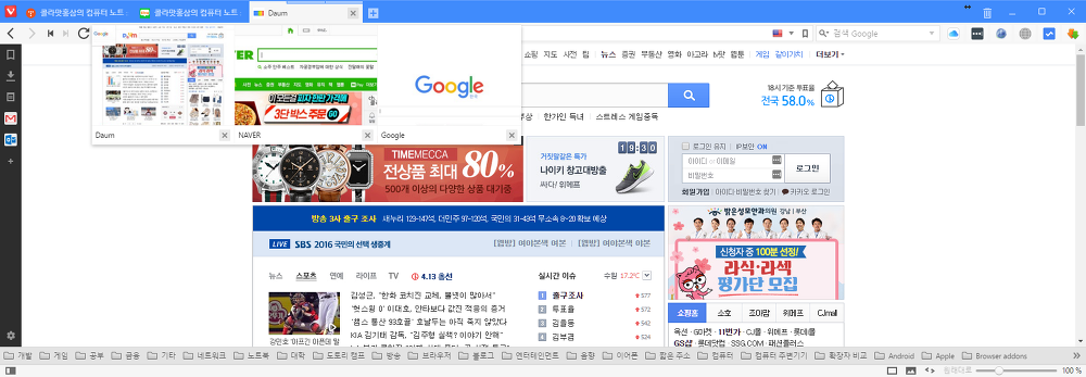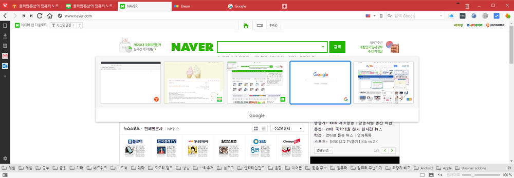 스크린샷을 보시면 아시겠지만, 탭의 순서랑 컨트롤+tab을 눌러 나온 탭 미리보기의 순서가 다릅니다.
