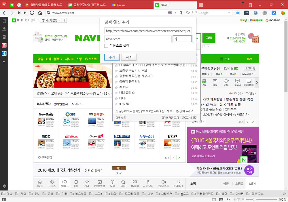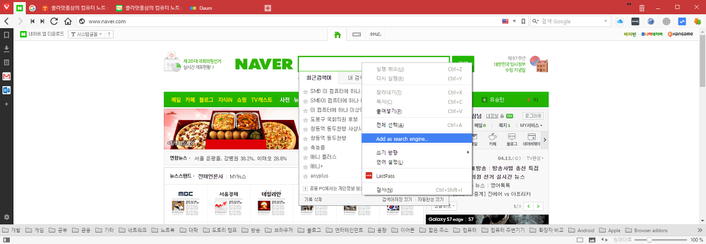 대부분의 브라우저가 검색엔진이 추가가 가능합니다.