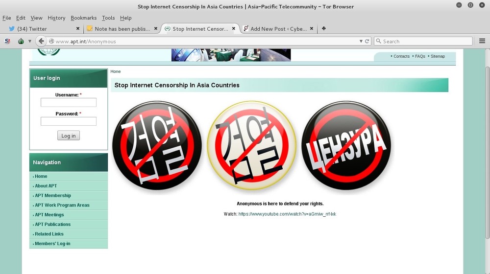 본론으로 가서. 어나니머스는 익명의 해커들로 구성된 단체인데요, 이 단체에서 12월 25일(현지시간) 아시아 태평양 전기 통신 협의체(APT, Asis Pacific Telecommunity)를 해킹하고 메인 화면에 한글로 ‘검열’이라고 바꿔버렸습니다.