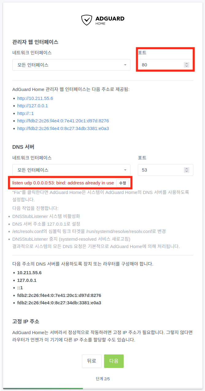 이미 사용중이라고 표시되어서 포트를 바꾸려고 시도해보았으나, 53포트가 아닌 경우 DNS 서버로 사용 불가능한 장치들이 있다. Windows와 macOS가 그렇다.