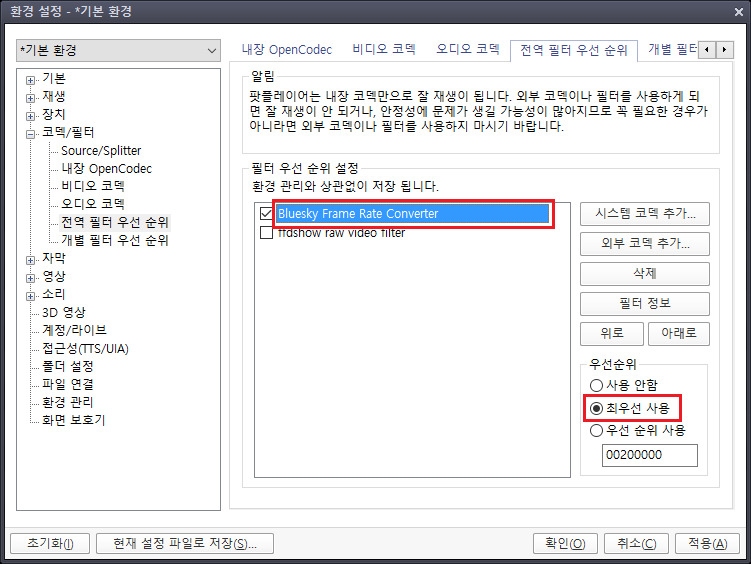저처럼 둘다 선택해서, Bluesky FRC를 원할 때는 Bluesky Frame Rate Converter를 체크하고, SVP를 원할 때는 ffdshow raw video filter를 체크해서 보셔도 됩니다.
