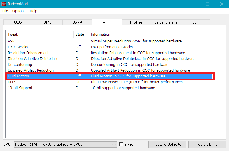 Fluid Motion을 On으로 변경하고 드라이버를 재시작 했으면, 1번 과정을 진행해주세요.