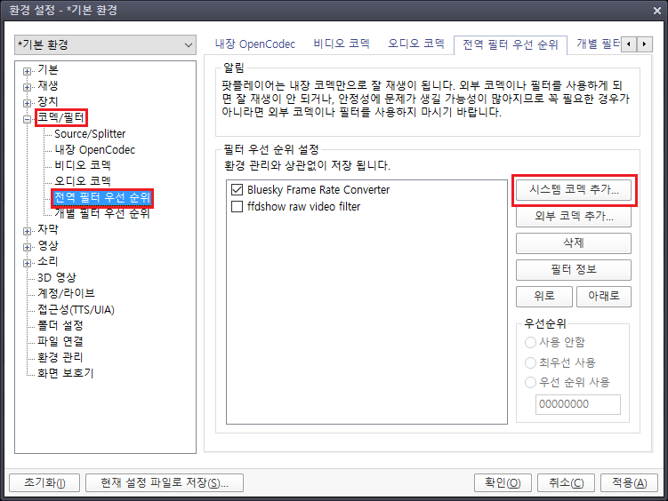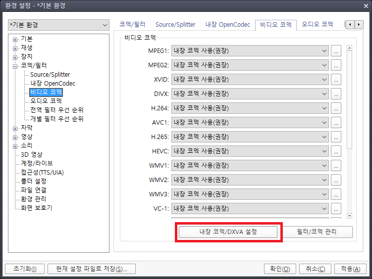 하단에 내장 코덱/DXVA 설정으로 이동합니다.