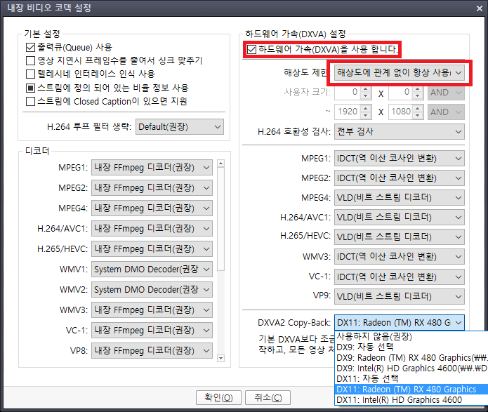 - Enabel support for DXVA decoder는 GPU 가속을 사용하려고 하는 경우를 선택해주세요