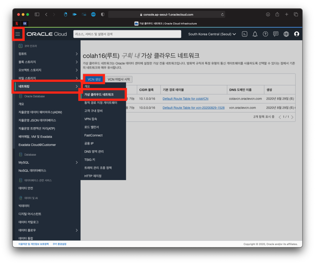 2. 네트워킹 -> 가상 클라우드 네트워크를 누릅니다