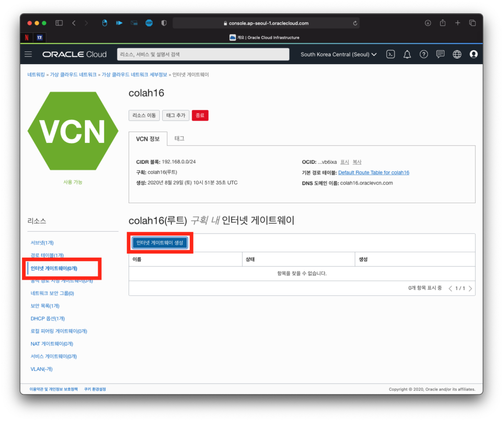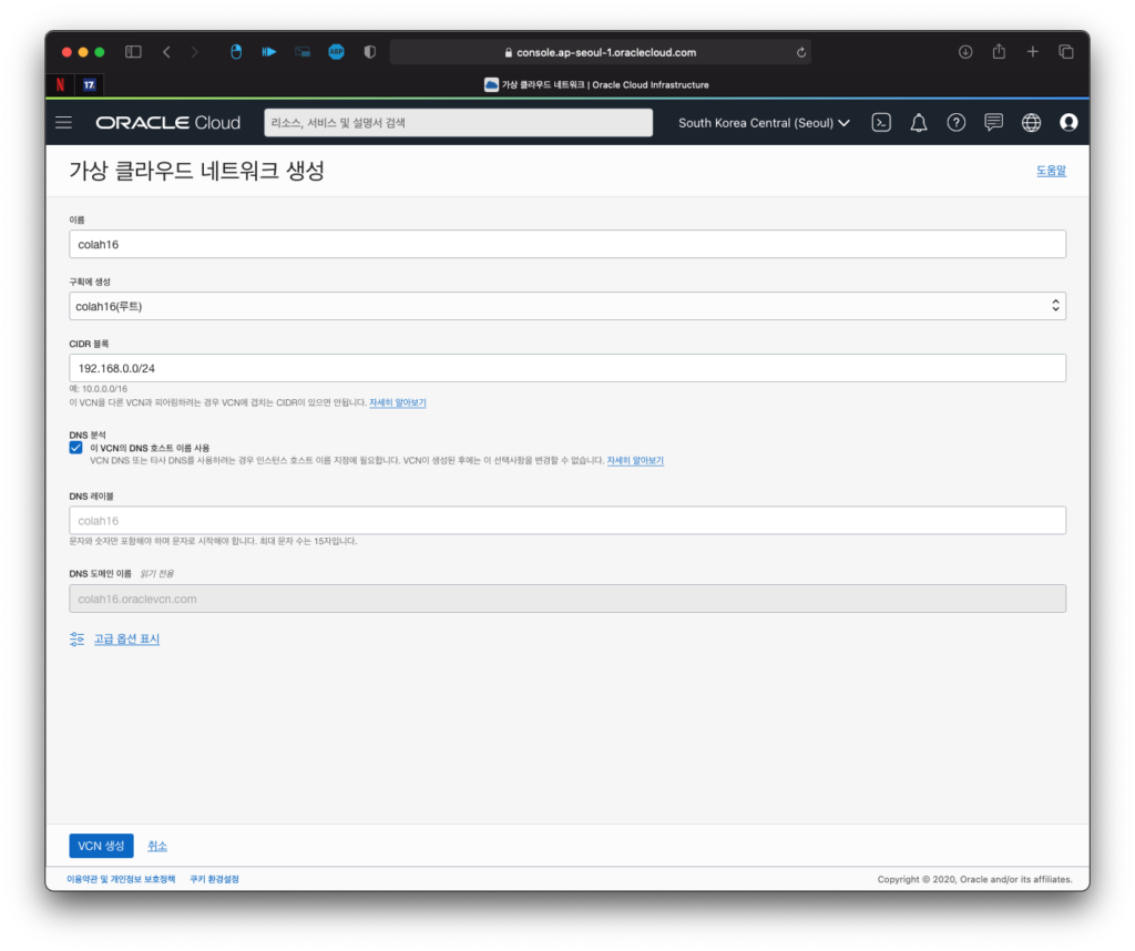 이 글에서 설명해드리는 VCN 추가 방법은 기존에 존재하는 VCN과 한가지만 다르고 모두 동일하게 만드는 방법을 서술하려고 합니다.