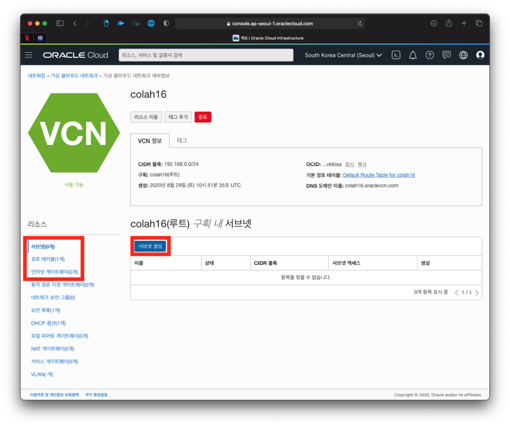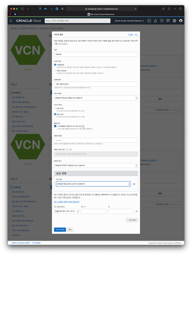서브넷을 여러개로 나눠야 할 필요성을 아직은 못느껴서 VCN의 모든 영역을 만드는 서브넷에 포함시켰습니다.