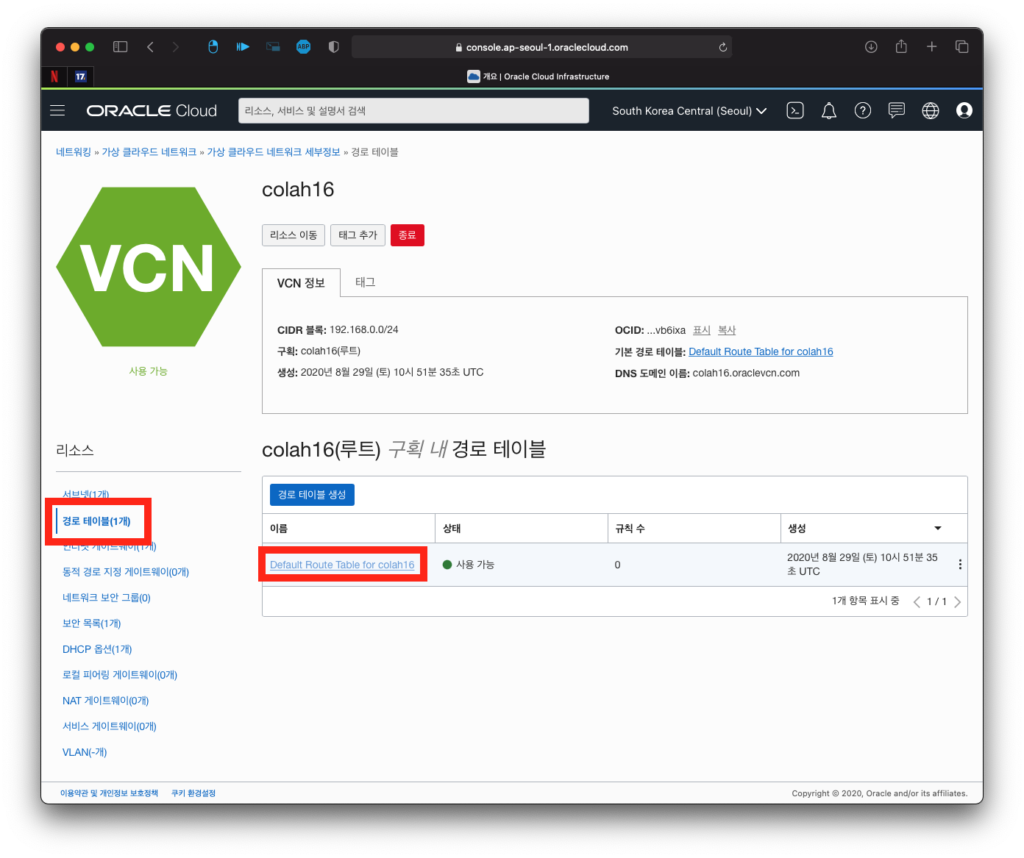 기본으로 구성되어 있는 경로 테이블의 이름을 클릭하여 경로 테이블 상세보기로 진입합니다.