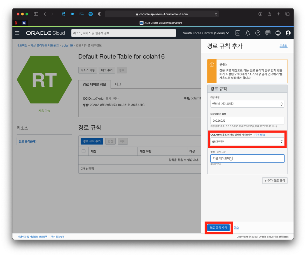 위에서 생성한 게이트웨이가 작동할 수 있도록 경로테이블에 추가해야 합니다.