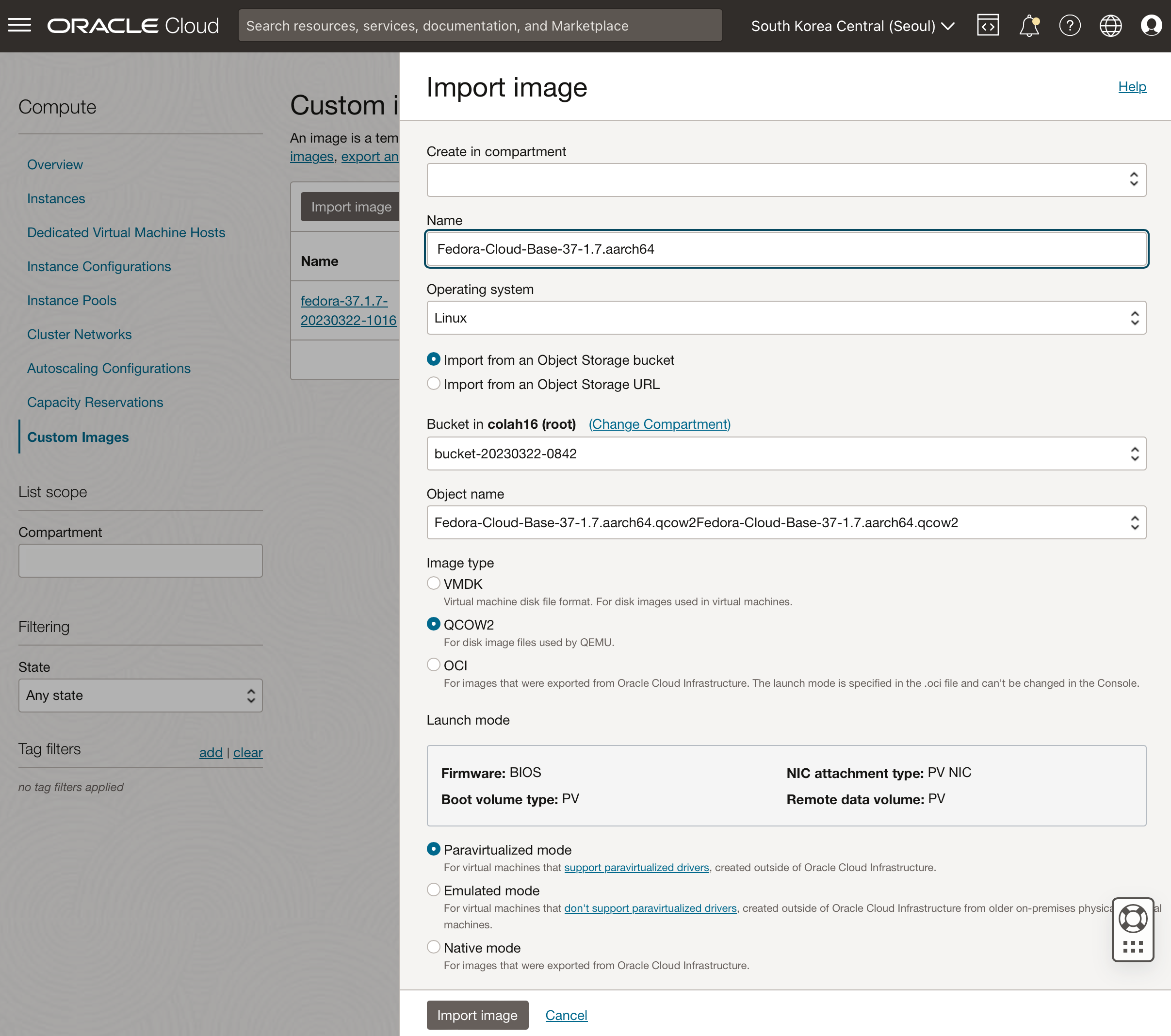 따라서 object storage standard로 업로드 하고, custom image로 import한 후에