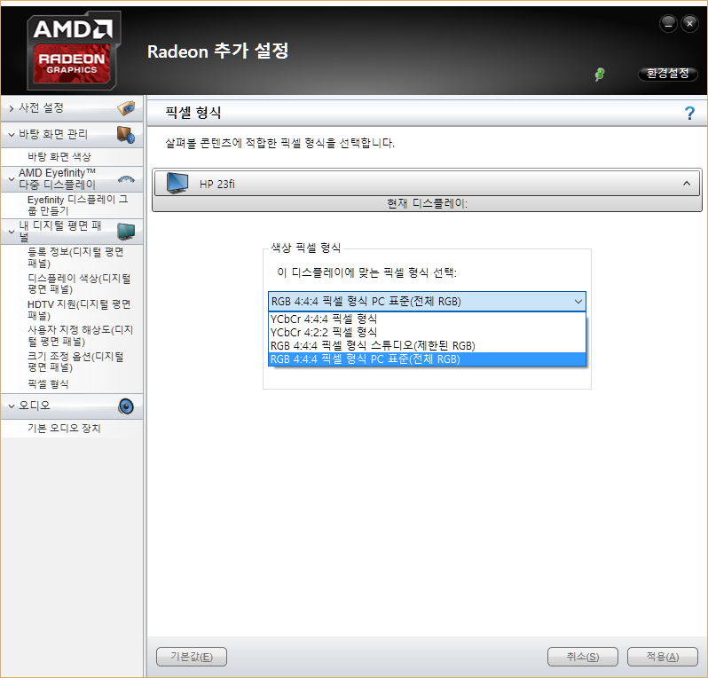 참고로 AMD 그래픽에서 YCbCr하면 엔비디아랑 비슷한 색감 나옵니다.